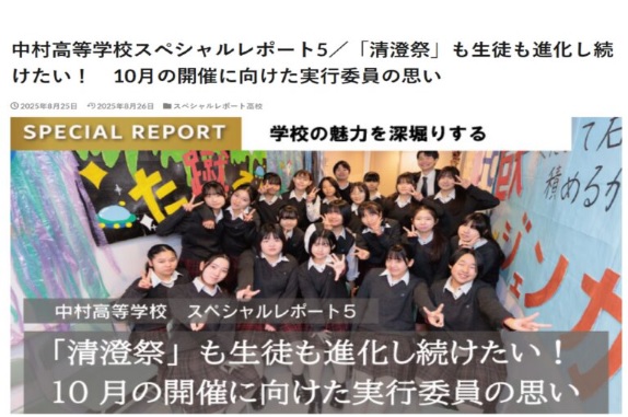 受験情報サイト「高校受験スタディ」に、本校が特集されました!今回の記事では、5年生(高校2年生)の実行委員長・副委員長の生徒2人のインタビューを通して、清澄祭に込められた思いや準備の舞台裏が紹介されています。
