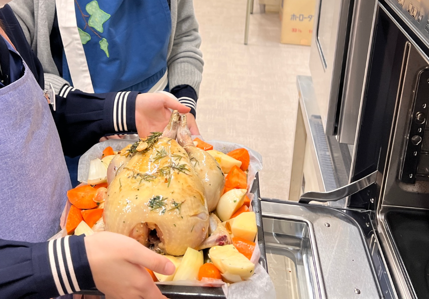 昨年12月、家庭科クラブでは冬休みの活動でクリスマス料理を作りました。今回は新たな挑戦として、以前から作っていた「ブッシュ・ド・ノエル」に加え、「丸鶏を使ったローストチキン」と「ホットワイン風葡萄ティー」を作りました。