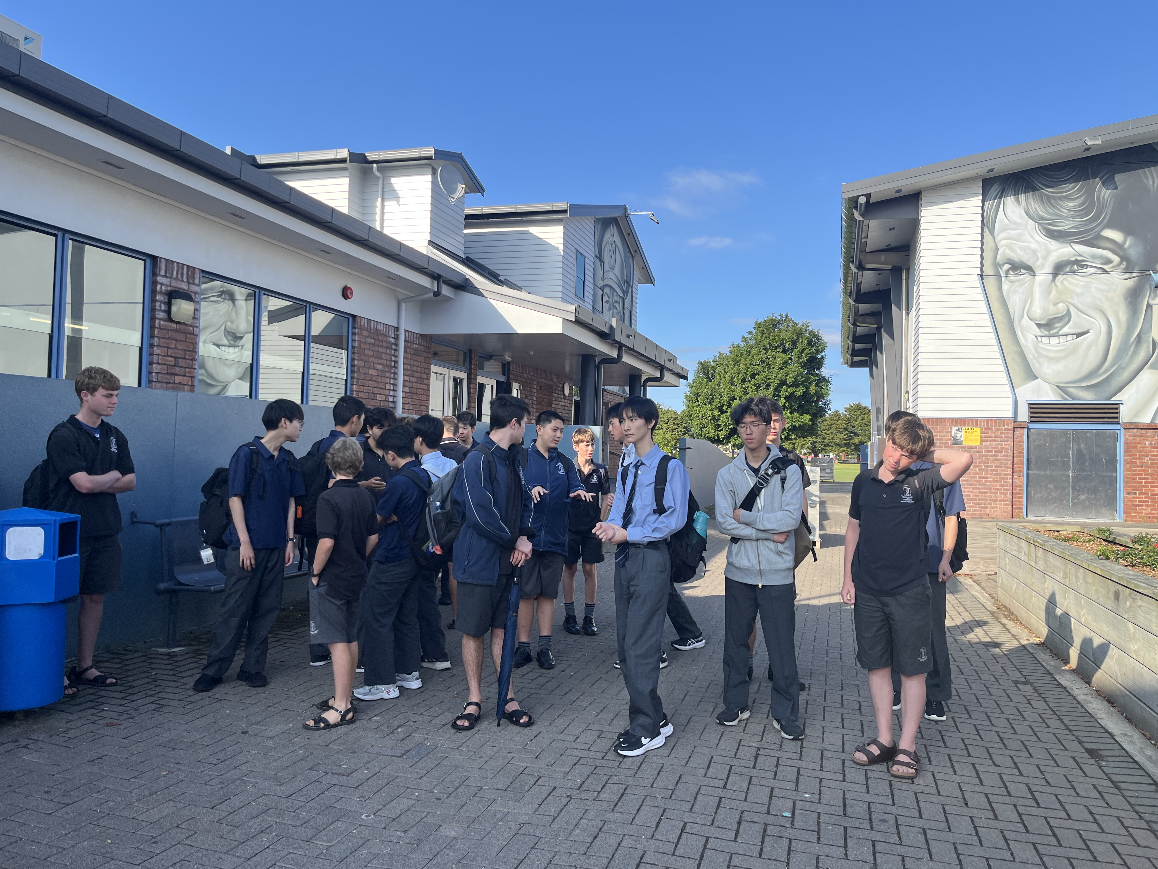 週末が明け、タウランガボーイズカレッジへの初の登校日でした。 1時間目は「Pōwhiri」という先住民であるマオリ式の儀式に参加させてもらい、現地の生徒たちがマオリの歌や踊りで歓迎してくれました。2時間目からはバディとなる現地の学生が藤嶺の生徒一人ひとりを迎えに来てくれ、ペアになり一緒に授業に参加しました。4時間目は、藤嶺生15名で英会話の授業です。生徒も頑張って英語で話します。お昼はバディが迎えに来てくれ、現地の生徒と一緒に昼食をとりました。午後の授業もバディと一緒に過ごし、終業後にはファミリーの待つ家に帰っていきました。緊張の初登校日、生徒たちはバディとの英語でのコミュニケーションの難しさを実感しつつも、日本との違いを楽しんだ様子です。