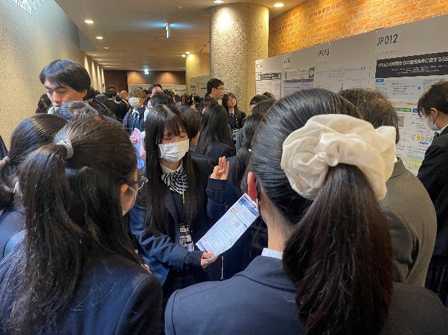 会場内ではたくさんの方が本校のポスターの前で足を止めてくださり、発表を聴いてくださいました。今まで時間をかけて準備を行ってきたため、研究者、学生、他校の生徒や先生方といったさまざまな方に発表を聴いていただける機会を持つことができて満足そうでした。