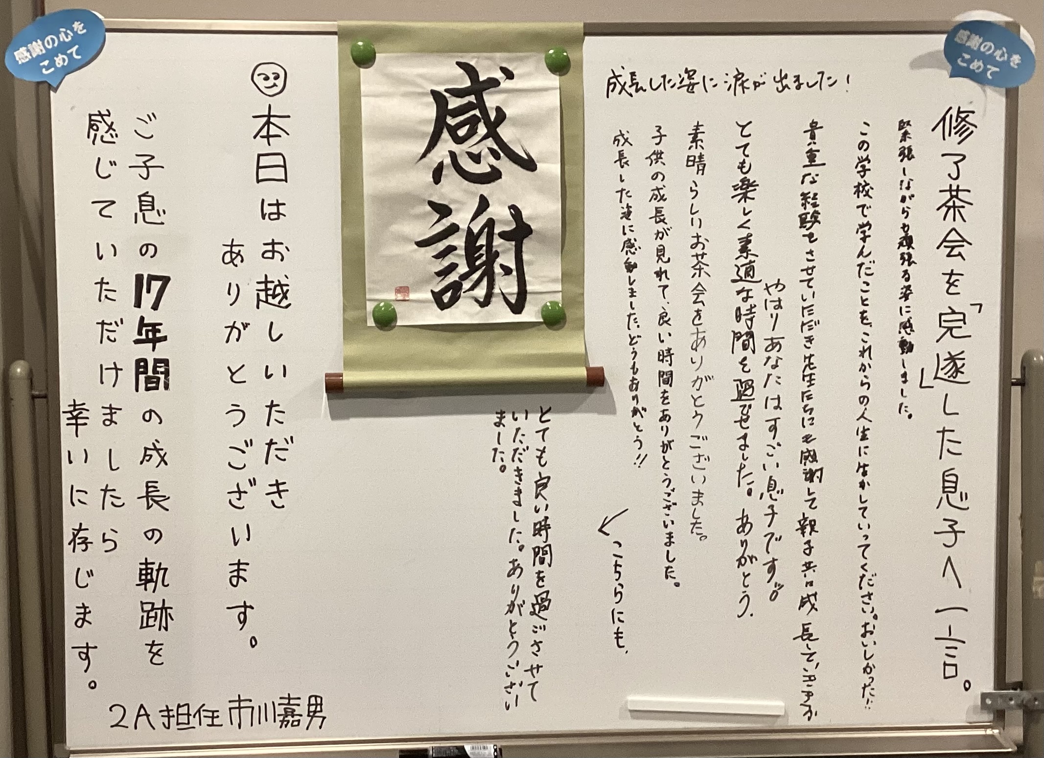 編入してきた生徒たちも補習に熱心に参加し、みるみる上達していきます。努力を重ねながら成長していく姿は、とても頼もしく感じられます。生徒一人ひとりが心を込めてお客様をお迎えする、大切な学びの機会となっており、一服に心を込めてお客様をお迎えするひとときが、学びの節目として心に残るお茶会となっています。