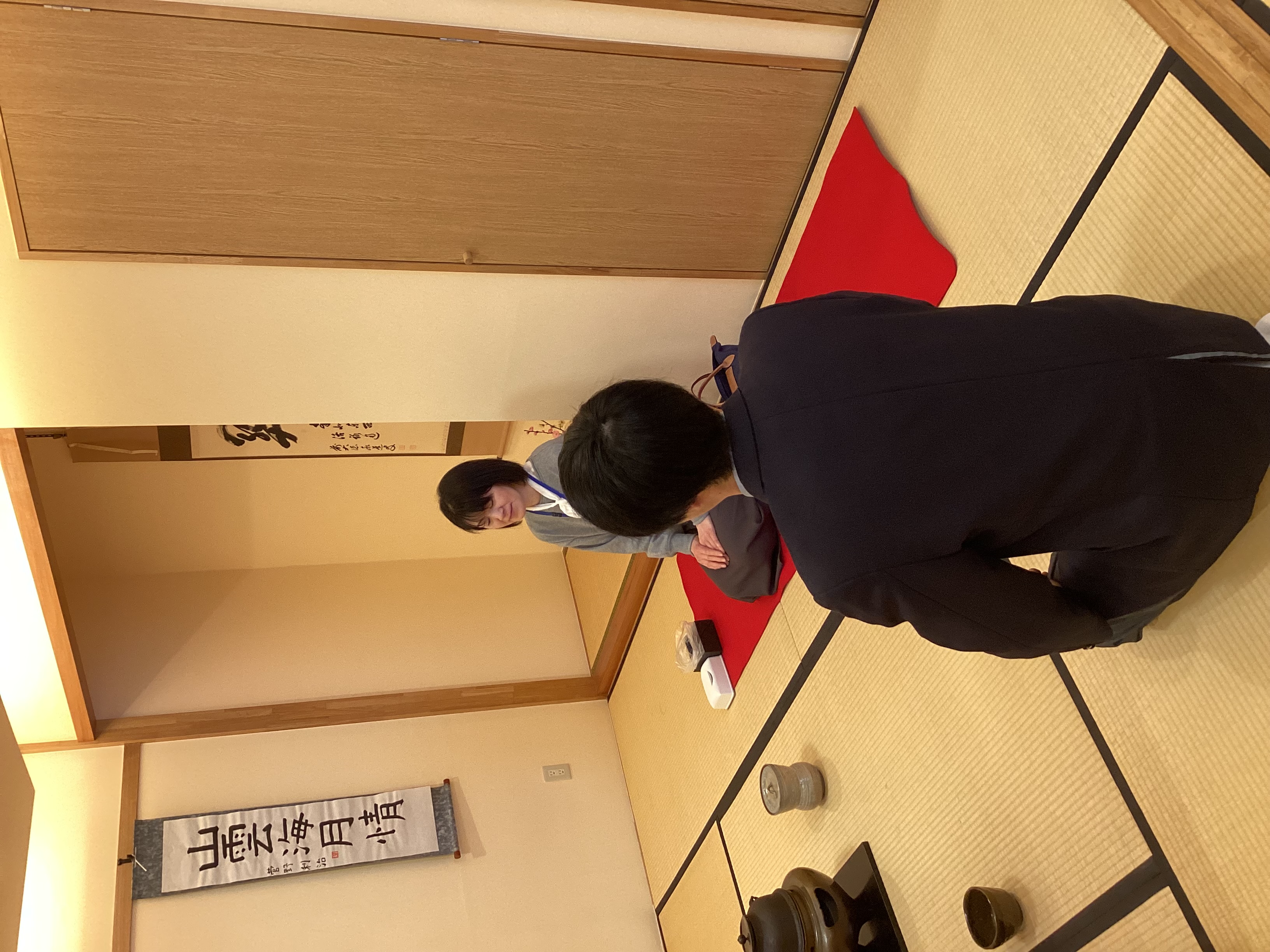 修了茶会では、一亭一客の形で席を設け、生徒が亭主となって挨拶をし、お点前をします。席にはそれぞれが選び書いた禅語の掛け軸を掛け、読み方や意味、選んだ理由を説明します。さらに、自作のお茶碗で心を込めてお茶を点て、お客様をおもてなしします。