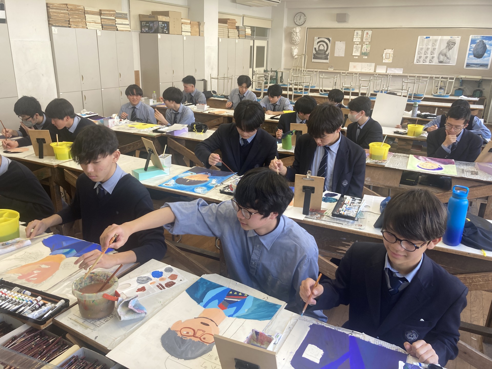 今学期では1年間の集大成として「15歳(16歳)の私」というテーマで自画像を制作しています。
