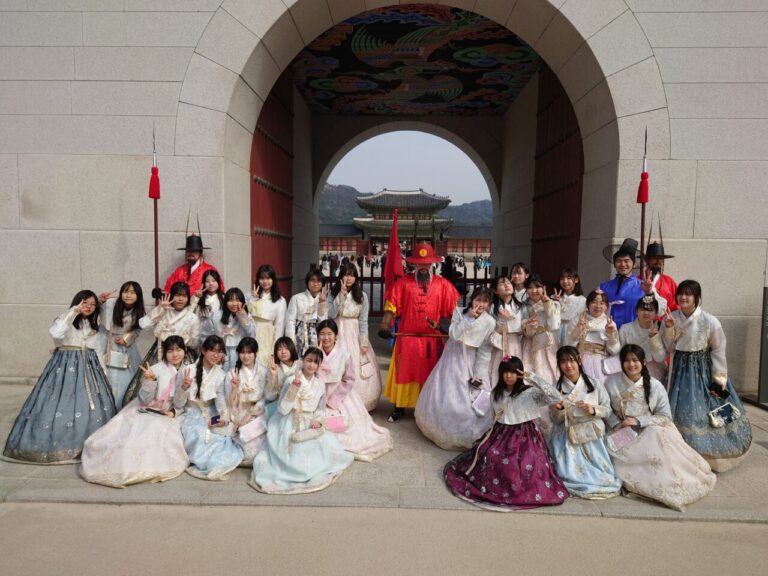 最終日は、チマチョゴリを着用して景福宮を訪れました。韓国の伝統衣装を実際に身につけることで、歴史ある空間をより身近に感じることができ、生徒たちは楽しみながら写真撮影や見学を行っていました。建物のつくりや身分による違いなどにも目を向け、韓国の歴史文化への理解を深める機会となりました。